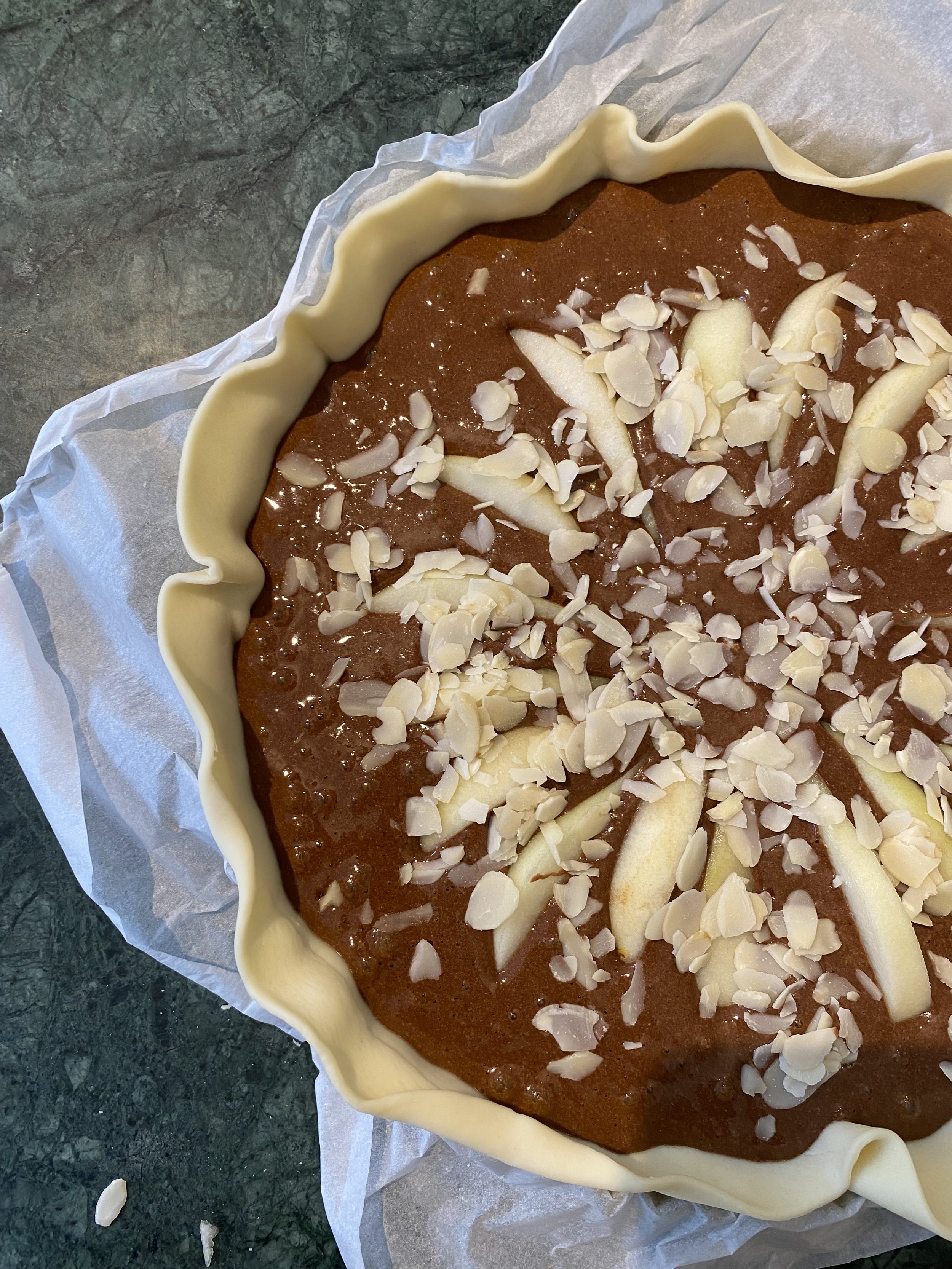 Een bladerdeeg taart met chocolade vulling en zachte peertjes