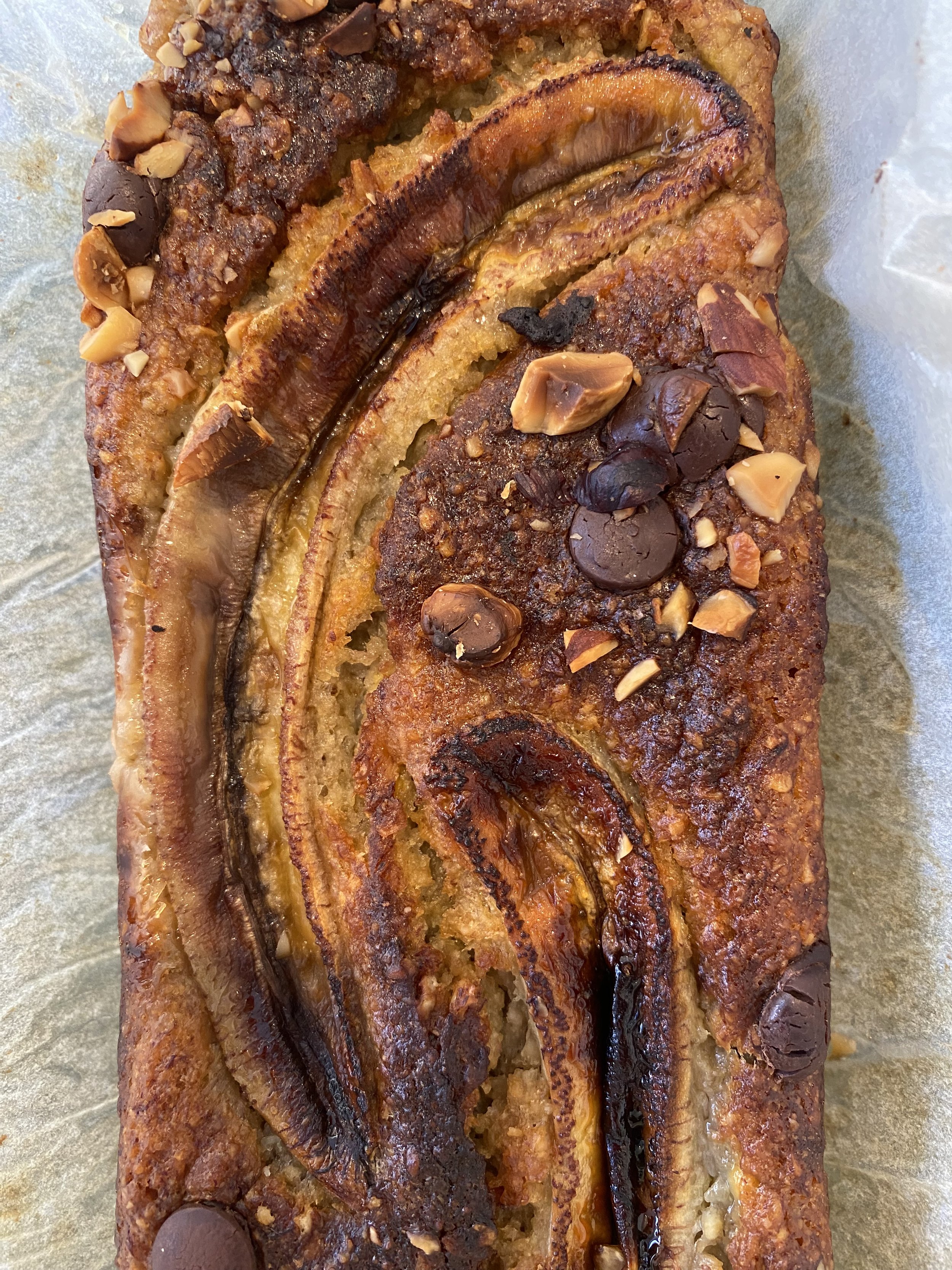 Lekker bananenbrood met stukjes chocolade, afgetopt met nootjes