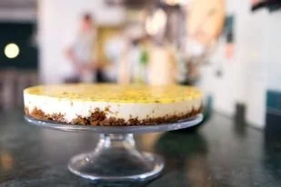 Heerlijke ongebakken kaastaart met sinaasappel en passievrucht.